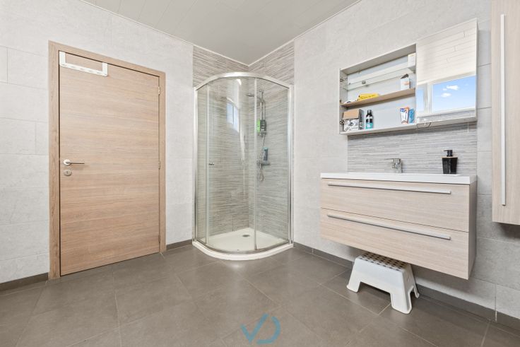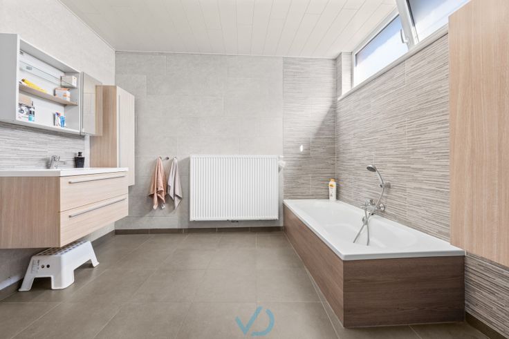 We betreden de woning via de inkomhal met apart toilet. Vervolgens komen we in de lichtrijke leefruimte, waar je geniet van een mooi zicht op de tuin. Aansluitend bevindt zich de open, volledig uitgeruste keuken, ideaal voor wie graag kookt met zicht op het groen. Naast de keuken is een praktische berging voorzien. Achteraan vinden we een ruime badkamer, ingericht met lavabomeubel, bad en douche. Op het gelijkvloers bevindt zich ook een eerste slaapkamer, ideaal als hoofdslaapkamer of als bureau-/hobbyruimte.