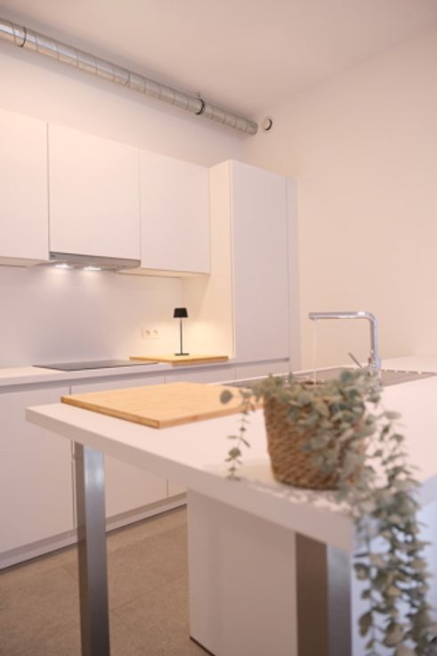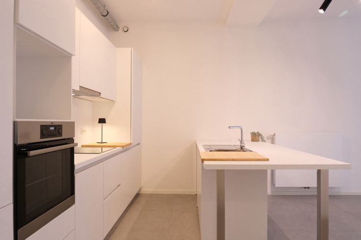 Deze woning omvat het volgende: een inkomhal, een toilet met wastafel, een superuitgeruste open keuken met een centraal eiland tegenover de ruime leefruimte met veel natuurlijk licht, een mooie slaapkamer met eigen douchekamer.