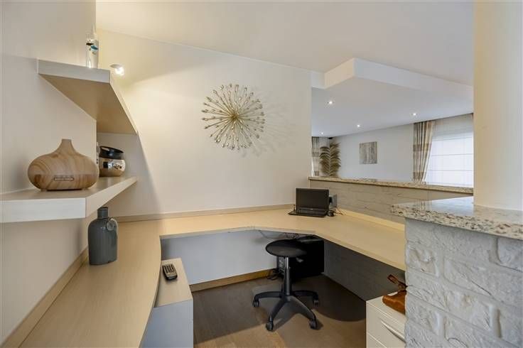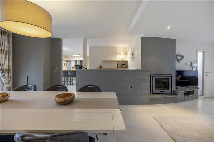 De sfeervolle zithoek, voorzien van een open haard, loopt over in een tweede eetruimte. Daarnaast is er een praktische bureauruimte die direct grenst aan zowel de leefruimte als de keuken.