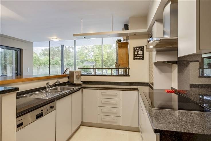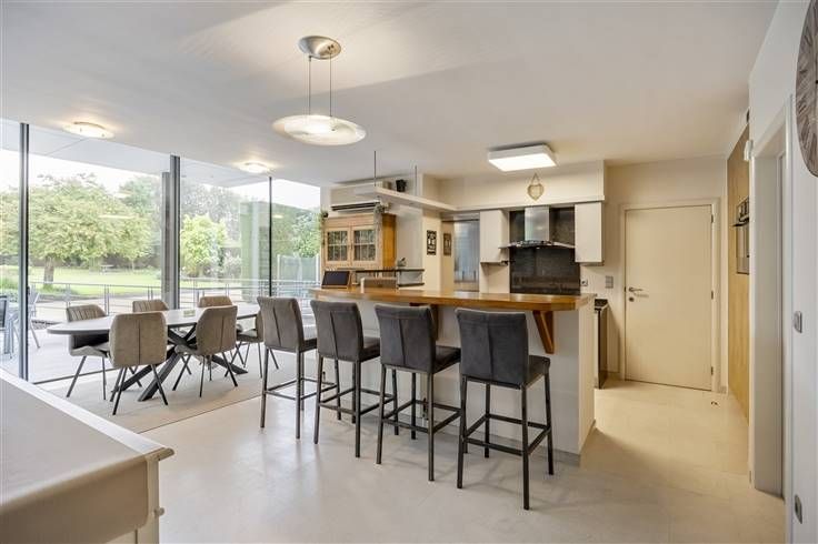 Deze villa beschikt over een gezellige keuken die naadloos overgaat in de eetkamer, waar grote raampartijen zorgen voor een prachtig uitzicht op de tuin.
