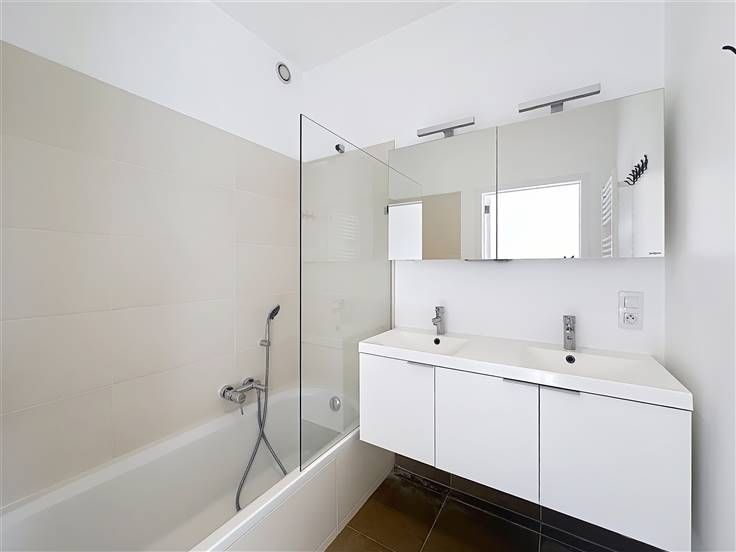 Er is een slaapkamer van ongeveer 14 m² met een aangrenzende badkamer (bad/douche en dubbele lavabo), en een tweede slaapkamer van ongeveer 11 m² met een eigen douchekamer (douche en lavabo). Het appartement is voorzien van aluminium ramen met dubbele beglazing, een gemeenschappelijke gasketel, een veiligheidsdeur en videofonie.