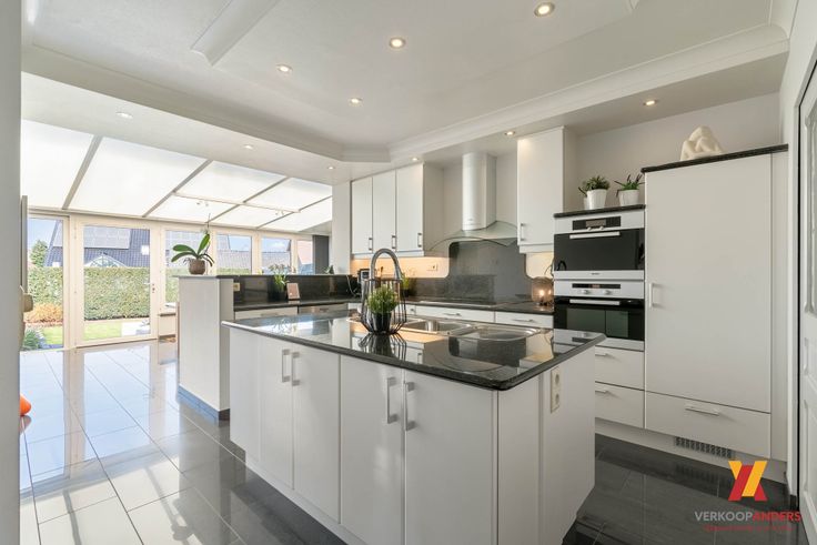 • Op het gelijkvloers bevindt zich een ruime living met sfeervolle gashaard die naadloos overgaat in de ruime, zonnige veranda met aansluitend een hoogwaardige keuken uitgerust met premium Miele toestellen. De automatische lamellen regelen de lichtinval in deze ruimtes.