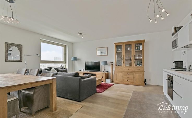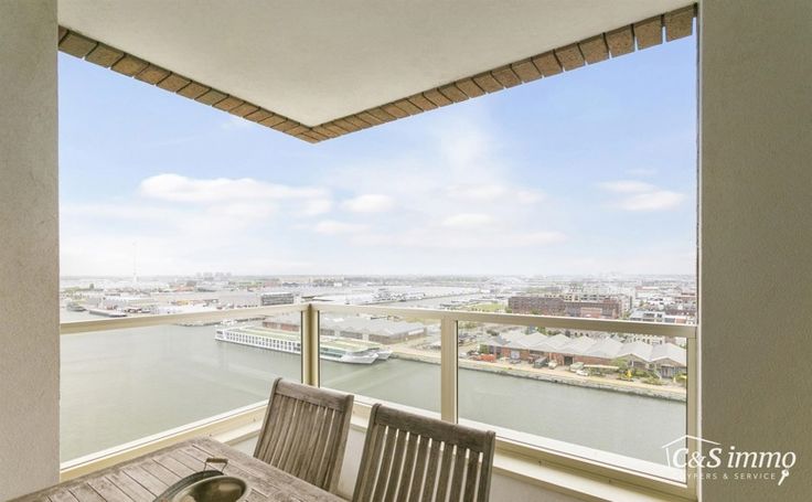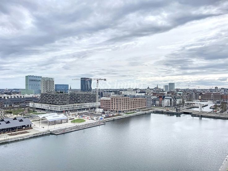 Dit instapklaar appartement (ca..94 m² ) bevindt zich op de 12e verdieping met waterzicht, op het bruisende Eilandje aan de Montevideo en op fietsafstand van het centrum. Inkomhal met toegang tot berging en apart toilet met handenwasser. Ruime woon- en eetkamer (ca. 43m²) op parketvloer met grote raampartijen en toegang tot het terras (ca.9m²). Zowel vanuit de woonkamer als het terras kan u ongestoord genieten van een uniek uitzicht over de Schelde en de dokken. De open ingerichte kwalitatieve keuken op tegelvloer is voorzien van een oven, keramisch kookplaat, koelkast met vriesvak en vaatwasser. Masterbedroom (ca. 15m²) en een tweede slaapkamer (ca. 11m²) alsook op parket. Deze laatste is ook perfect in te richten als bureau, hobbyruimte of kinderkamer. Op het einde van de hal bevindt zich een ingerichte badkamer op tegelvloer voorzien van ligbad met douchemogelijkheid, handdoekradiator en dubbel badkamermeubel. Kelderberging. Autostaanplaats voor €35.000. Toplocatie met alle winkels en restaurants op loopafstand. Kelderberging inclusief.