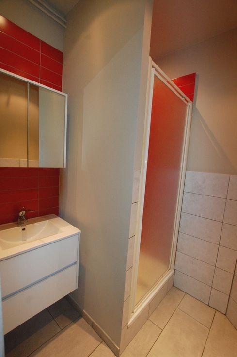 Hall - Living de +/- 15 m² avec vinyle - Cuisine semi équipée (meubles, évier et taques électriques) - 1 Chambre à coucher de +/- 15 m² avec vinyle - 1 Salle de douche (douche & lavabo) & 1 WC indépendant sur le palier et accessible uniquement par la cage d'escalier commune.