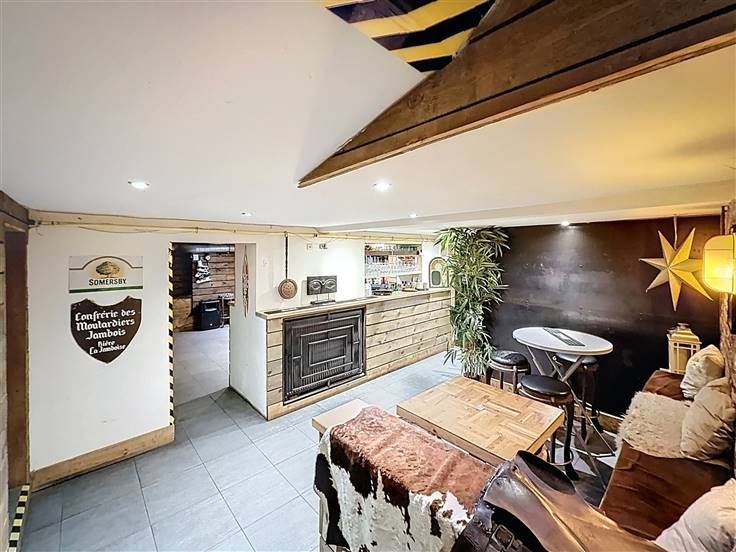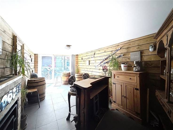 Het pand bestaat uit een hoofdruimte aan de voorkant (ongeveer 22 m²) met een etalage aan de straat, ideaal om klanten te ontvangen. Een paar treden verder biedt een grote kelderruimte van ca. 120 m² een aantal indelingsmogelijkheden. Deze is onderverdeeld in 2 ruime kamers, een bargedeelte, een ingerichte keuken, een bijkeuken (met een professionele vriezer) en apart sanitair (mannen- en vrouwentoilet). Reserve (of kelder).