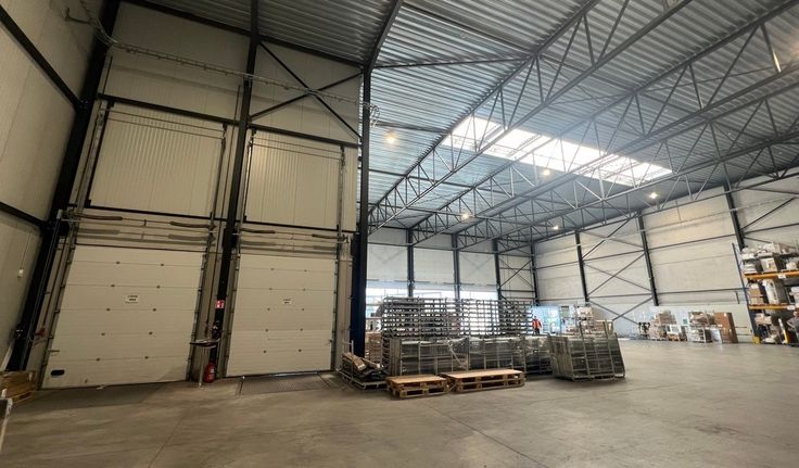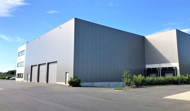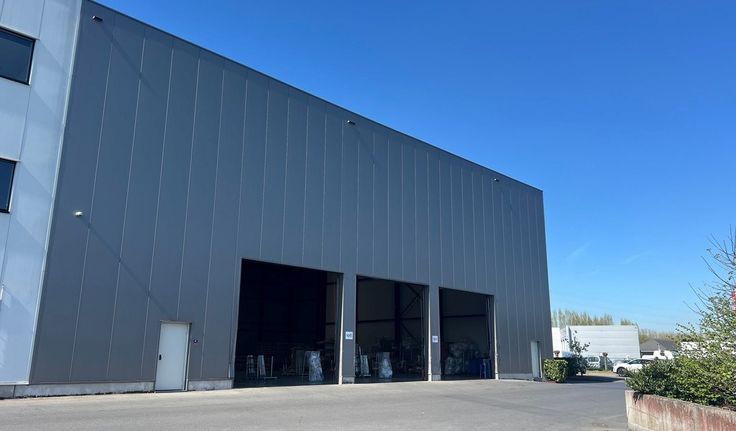 Specificaties magazijn: gevel in aluminium bardage, staalstructuur, vrije hoogte ca. 9m , volledige overspanning, 3 automatische sectionale poorten 5m (b) x 4,5m (h) en 2 laadkades, lichtstraten, geïsoleerd steeldeck, polybetonvloer, 2 toiletten, 6 parkings, mogelijkheid tot huren kantoor op bedrijvensite