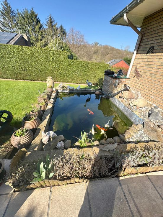 A l'extérieur de la maison : barrières électriques, beau jardin avec abri de jardin très bien entretenu par les propriétaires ( différents arbres fruitier, palmier, étang,...).