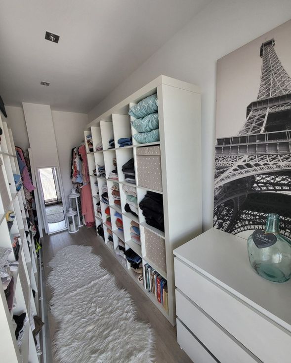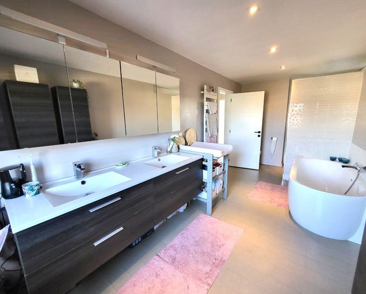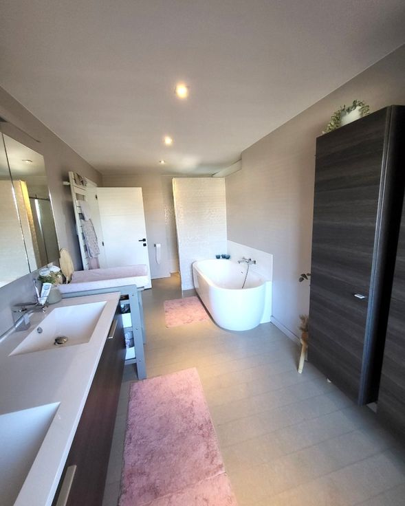 Twee ruime slaapkamers, waaronder één met een aangrenzende dressing (10m² + 19m²) bieden volop ruimte en comfort. De ruime badkamer is uitgerust met een dubbele lavabo, douche én ligbad – een plek om echt tot rust te komen.