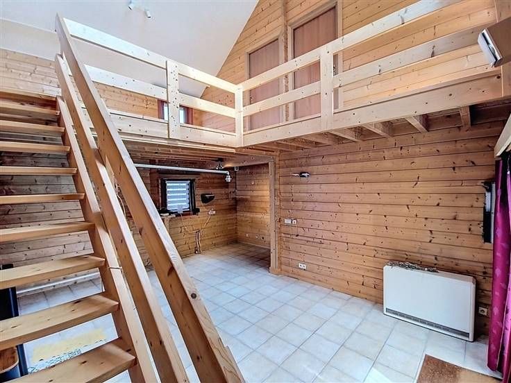 Het huis heeft een totale oppervlakte van 100 m² en is gebouwd in een houten structuur met een lichtgekleurde bakstenen gevel.