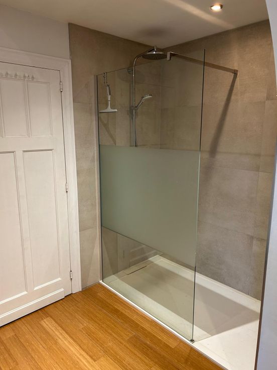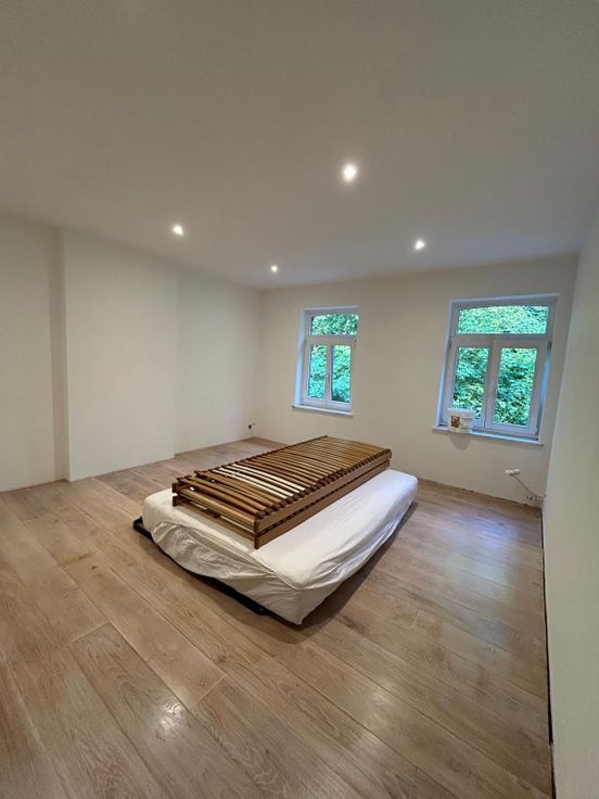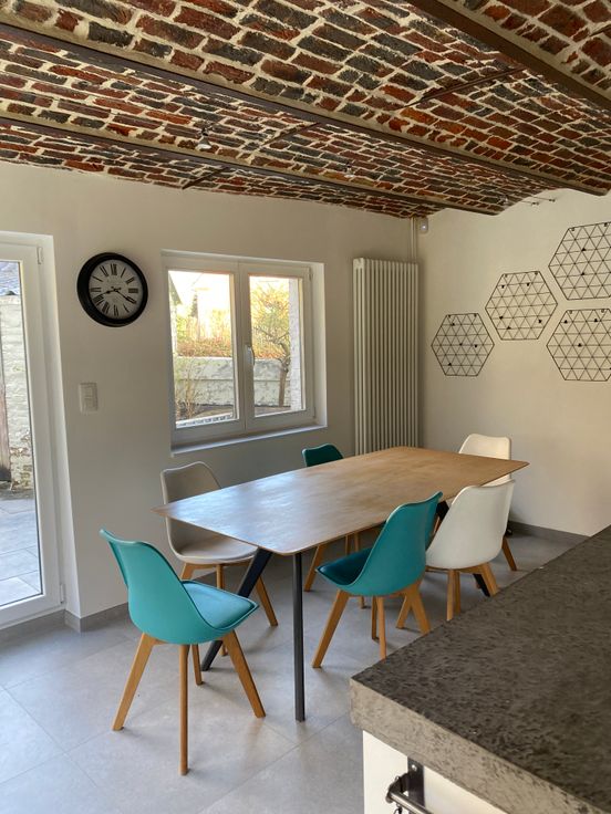 Etage avec 2 grandes chambres (16m2) et une très grande chambre (24m2) avec son dressing équipé de 4.8m d'armoires. Salle de bain inspiration marocaine, d’un ton apaisant avec grand douche à l'italienne, baignoire et WC. Carrelage hyper pratique (on ne voit pas les taches !) et clair au rez. À l’étage, sol chaleureux en bois (bambou dans la suite parentale et la salle de bain et planchers à planches larges en chêne massif ailleurs)