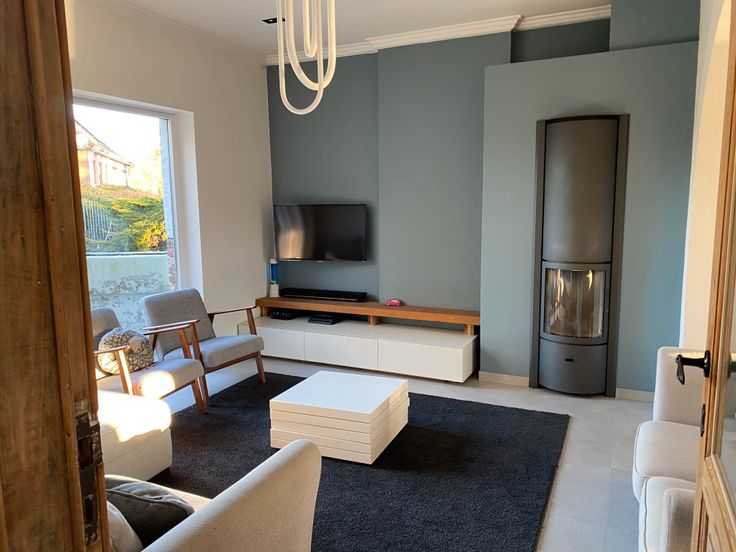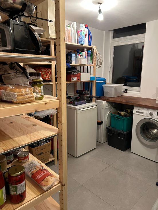 Cuisine équipée avec buanderie attenante (photos vide et remplie), salon avec feu ouvert Stuv ouvert sur la salle à manger. WC et vestiaire, grand couloir central.