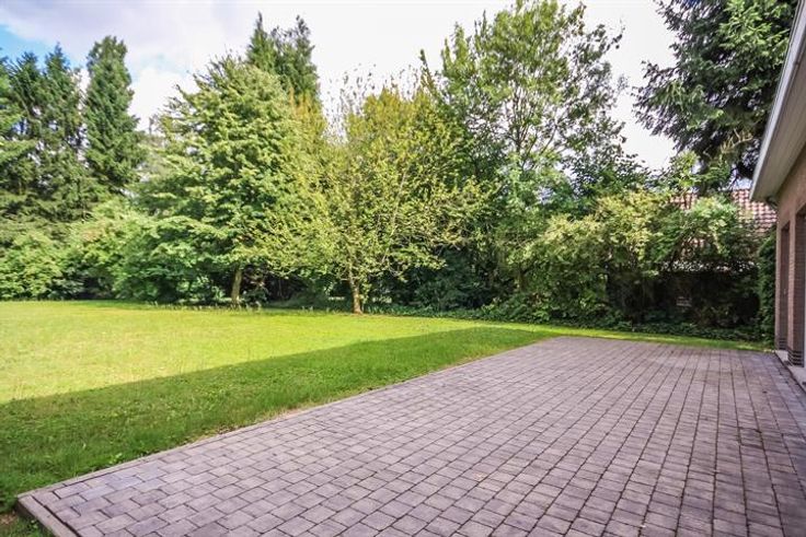 Inkomhal met toilet (tegelvloer) - woonkamer 45,6m² (parket) - eetkamer 16m² (tegelvloer) - gesloten keuken 12,5m² (tegelvloer): vaatwasmachine, oven, keramisch kookvuur - bureau 10m² (tegelvloer) - garage 16,8m², voor 1 wagen, met elektrische poort - terras 30m² - omheinde tuin met tuinhuis.