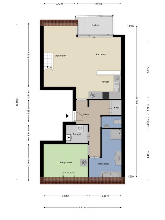 Gelijksvloers: Inkomhal, open leefruimte met eetkamer en keuken, slaapkamer, badkamer, apart toilet, terras en berging.