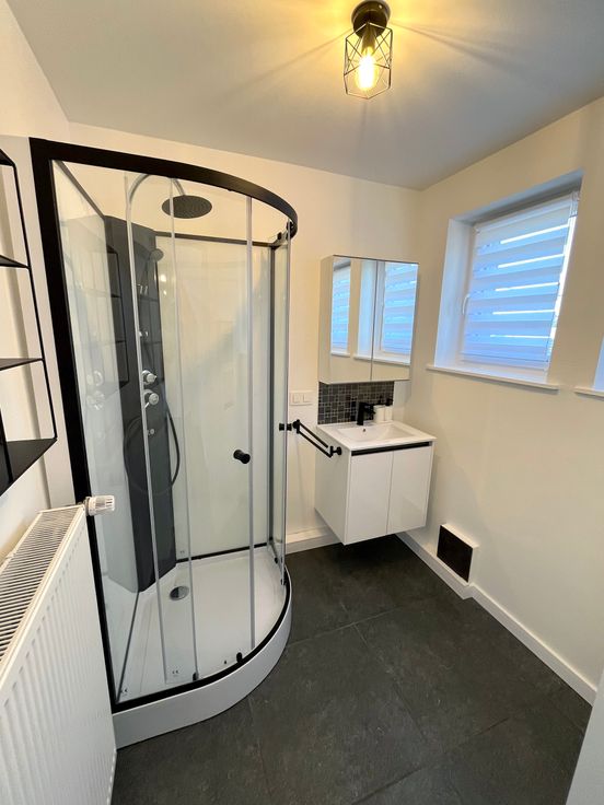 A l’étage, la salle de bain se compose d’une douche et d’un lavabo.