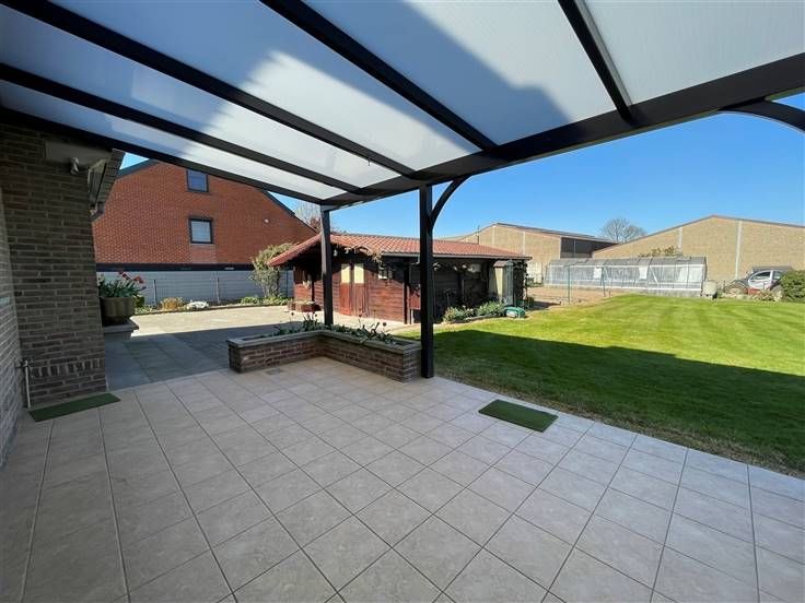 Extérieur : terrasse (+/- 14 m²) et jardin, chalet de jardin, potager, serre, abri pour stocker du bois, 3 emplacements de parking à l'avant.