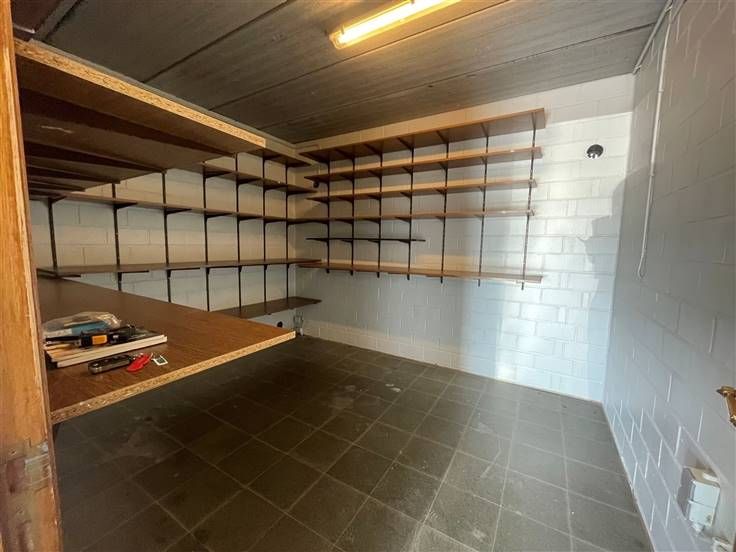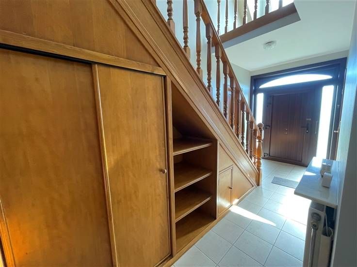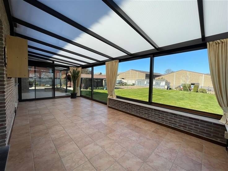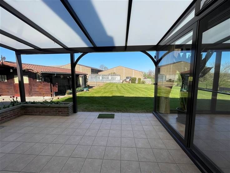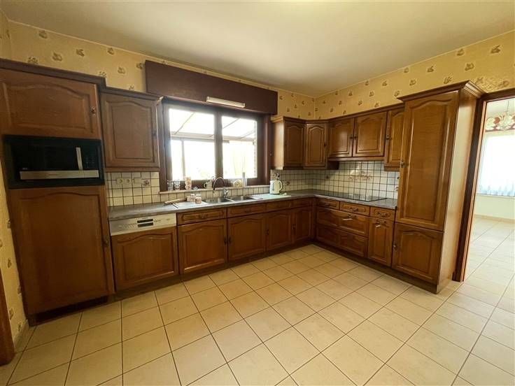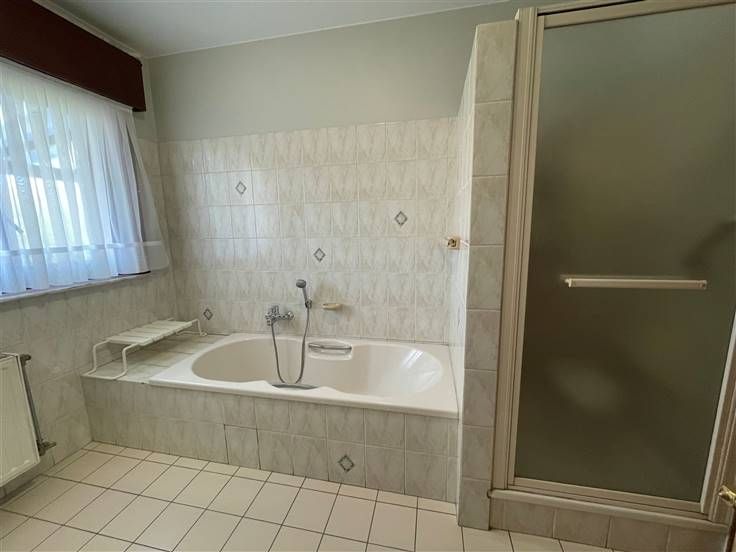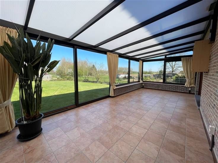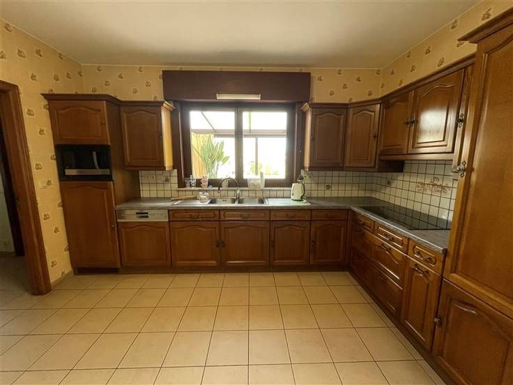 Rez-de-chaussée : Hall d'entrée (+/- 9.5m²), hall de nuit (+/- 8m²), WC séparé avec lave-mains (+/- 1.5m²), séjour (+/- 37m²), véranda (+/- 27m²), buanderie (+/- 8m²), cuisine équipée (+/- 13 m²) - évier double bacs, taque vitrocéramique, hotte, four, frigo + freezer et lave-vaisselle -, salle de bain (+/- 8m²)- baignoire, douche, wc et lavabo- chambre 1 (+/- 13.5m²), bureau (+/-12m²), réserve (+/- 10.5m²) et garage avec porte sectionnelle automatique (+/-23m²)