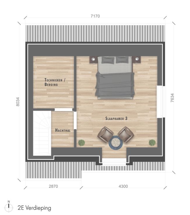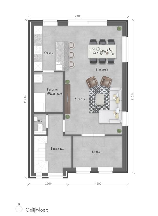 De leefruimte baadt in het licht dankzij grote ramen en vloeit naadloos over in de open, volledig uitgeruste keuken. Op het gelijkvloers is er bovendien een handige bureauruimte of polyvalente kamer – ideaal voor thuiswerk of een zelfstandige activiteit.