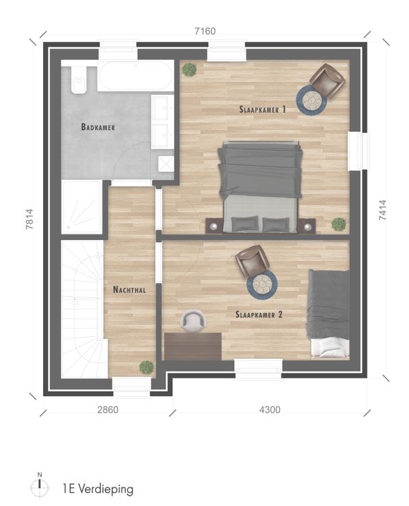 Op de eerste verdieping bevinden zich twee slaapkamers en een badkamer met ligbad, douche en dubbele lavabo. De tweede verdieping herbergt een royale master bedroom van 24 m².