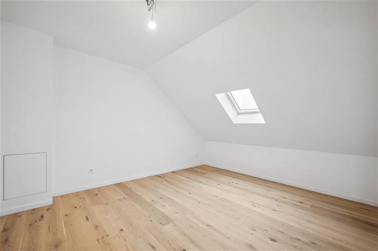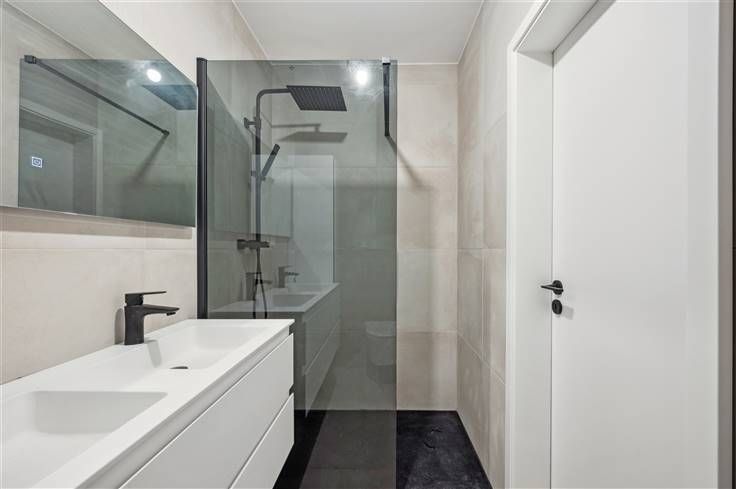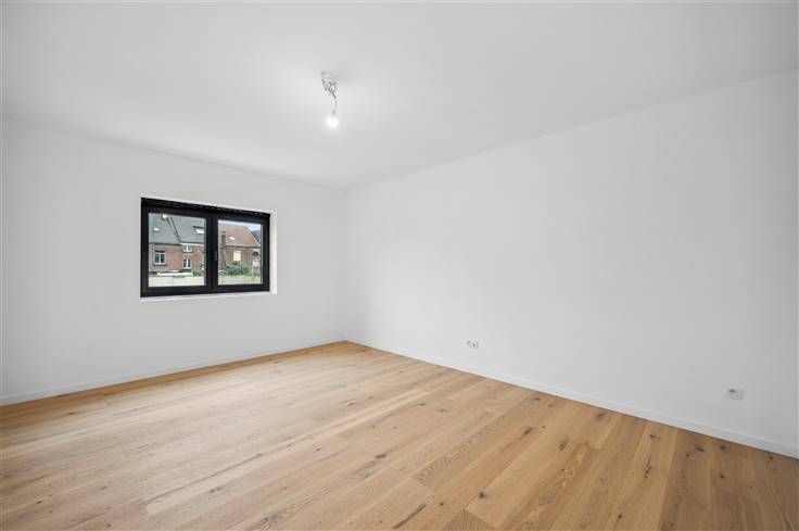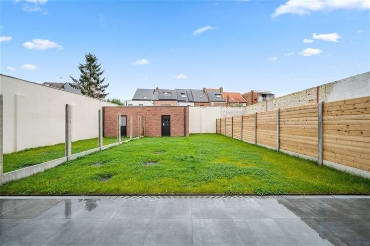 Met een E-peil van E8, kiest u met dit huis resoluut voor de toekomst, inclusief 8 zonnepanelen, ventilatiesysteem C, warmtepomp (lucht/water), overal vloerverwarming, zwarte aluminium ramen, volledig afgewerkte opdekdeuren, regenwaterpomp met filters, etc. Alle muren zijn al voorzien van een primerlaag. Opvallend in huis, is de aanwezigheid van diepe ingebouwde kasten op het gelijkvloers (ruimte naast inkomhal) en op de eerste verdieping. De royaal bemeten living en open keuken, kijken uit op een betegeld terras met afvoergeul en een mooi omheinde tuin met grasveld (beton/houtafsluiting), plus een gemetst afgewerkt, goed geïsoleerd tuinhuis. De tuin is hier nog een stuk breder dan het huis. Aan de L-vormige open eetkeuken kunnen een paar bewoners aanschuiven aan de breakfast bar. Net als de trapbekleding, is voor het werkblad zwarte graniet gebruikt. We spotten hier volgende apparaten: dampkap, kookplaat, koelkast, freezer, microgolf, oven en vaatwasser. Opvallend is de mooie overgang van de tegelvloer binnen naar de tegelvloer van het terras buiten, waar het profiel van het schuifraam mooi is ingewerkt, zodat er niemand over hoeft te struikelen. De 3 kamers onderscheiden zich op twee vlakken, namelijk een mooie parketvloer en de grote oppervlakte van iedere kamer. De halfopen werkruimte op de 2e verdieping is ideaal als hobbyruimte/werkruimte. De badkamer omvat een inloopdouche met regenfunctie en donkere glaswand, een dubbel lavabomeubel met brede spiegel en hangtoilet