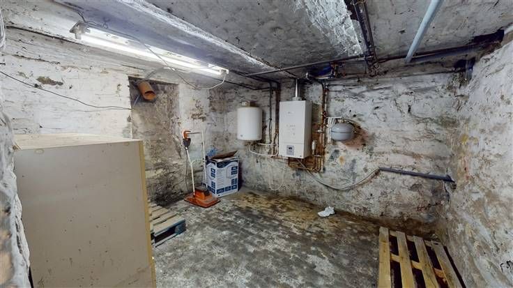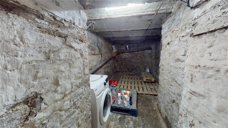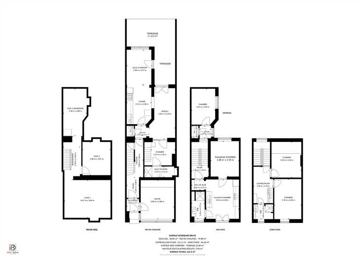 Sous-sol : dégagement (+/-8 m²), 3 caves (+/-18, et 2x +/-11 m², avec emplac. machines et compt.).