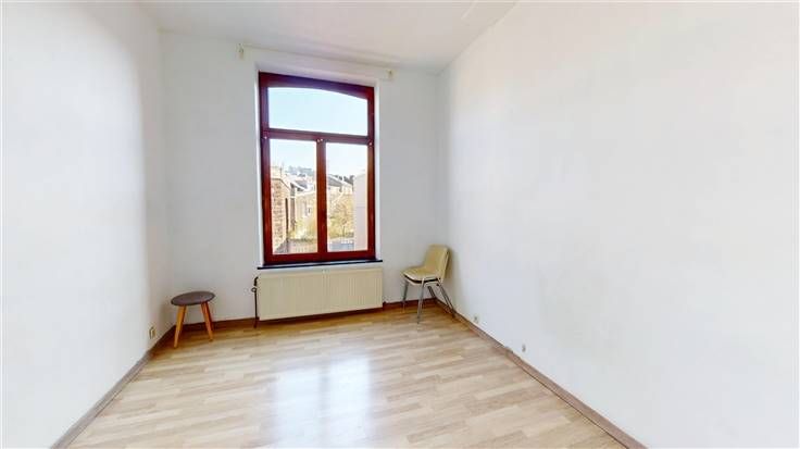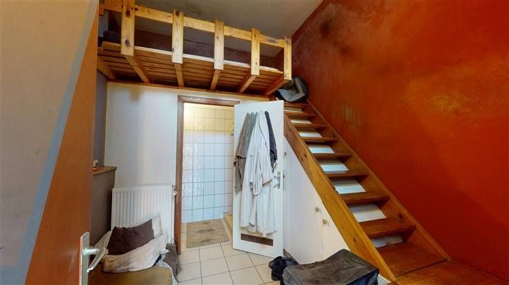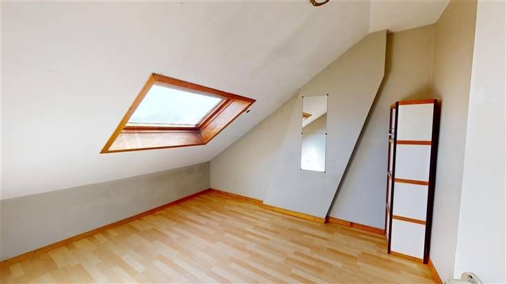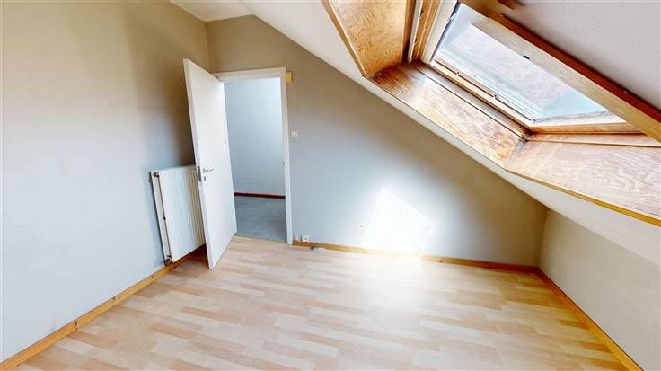 2ème étage : palier actuellement aménagé en coin cuisine (+/-7 m²), 2 chambres mansardées (+/- 2x 11 m²), sdb (+/-3 m², avec douche et lavabo).