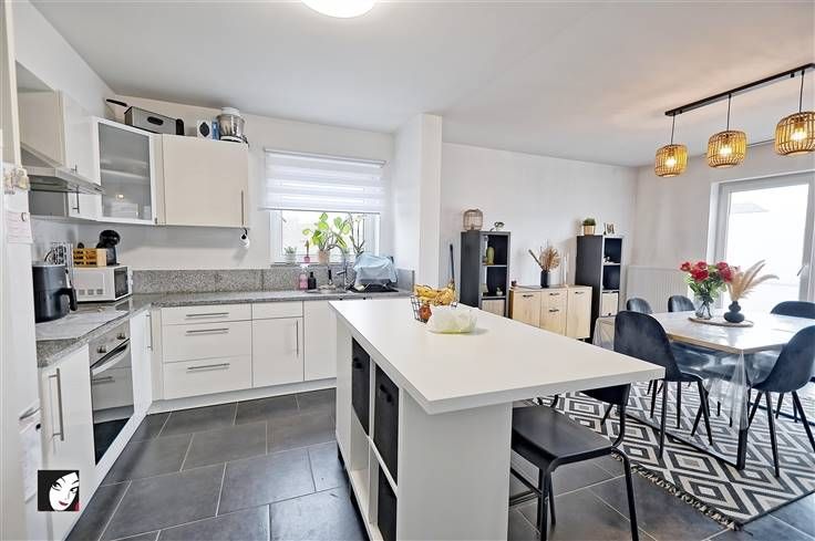 Sorry er is geen nederlandse vertaling beschikbaar. Appartement situé au 1er étage (sans ascenseur) dans une copropriété de 3 logements, très convivial et fonctionnel. Composition : hall d’entrée, séjour avec cuisine intégrée semi-équipée + coin repas, 2 chambres (1 parentale et 1 enfant ou bureau), salle-de-douche, espace buanderie + rangement. Châssis double-vitrage en PVC, chauffage central au gaz de ville assurant également la production de l’eau chaude, chaudière et compteur individuels, béton + carrelage, parlophone (Informations indicatives et non contractuelles)