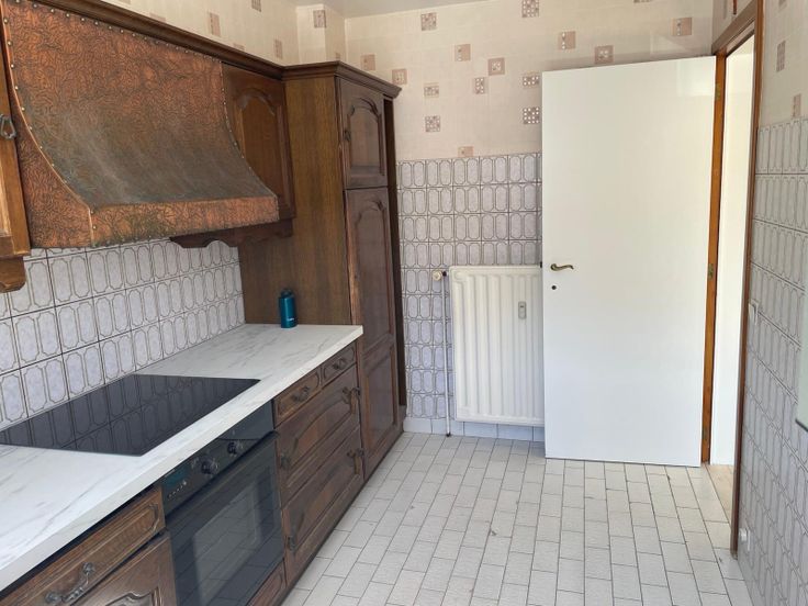 Keuken is vernieuwd met keukenblad, wasbak, kookplaat, afwasmachine, oven en inbouwfrigo.
