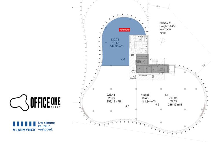 De volledige vierde verdieping wordt te koop aangeboden en biedt een fenomenaal uitzicht over de Rijkegemkouter. Het verdiep heeft een oppervlakte van 780 m², waar momenteel één deel van verhuurd en volledig ingericht is, de overige drie delen zijn nog volledig open en kunnen afgewerkt worden naar wens en kunnen bijgevolg ook afzonderlijk verhuurd of zelf ingenomen worden.