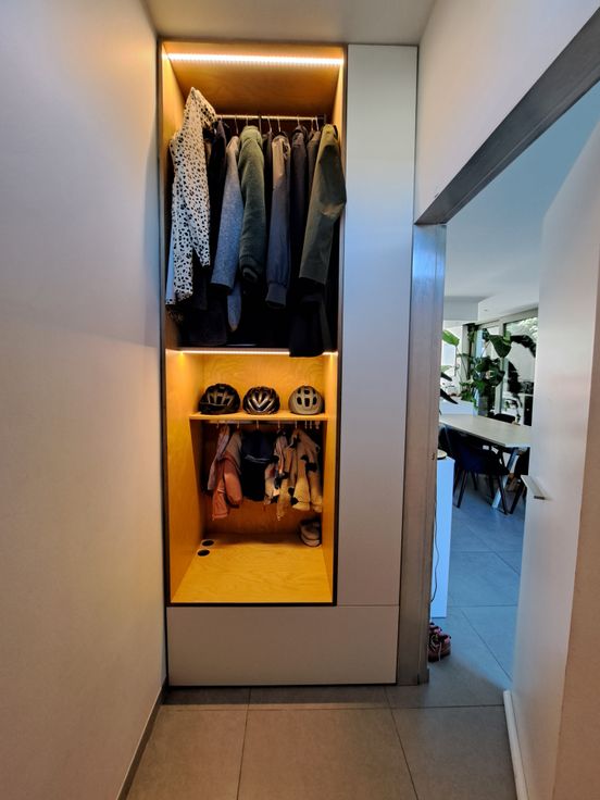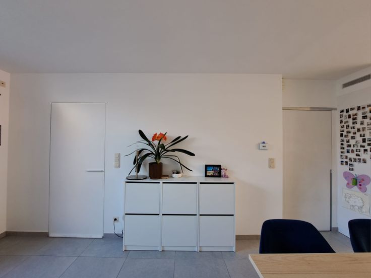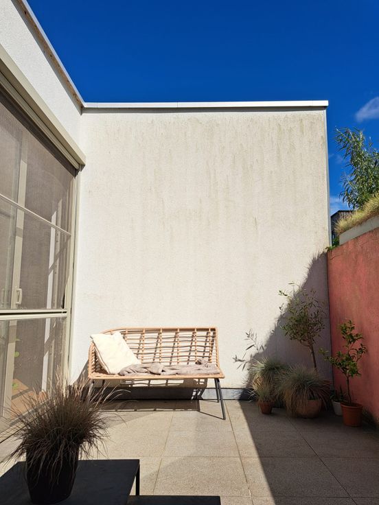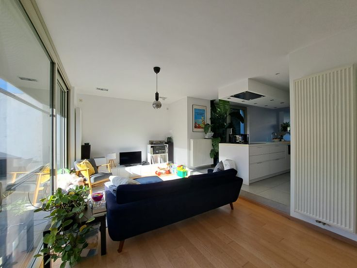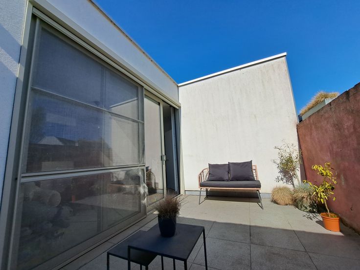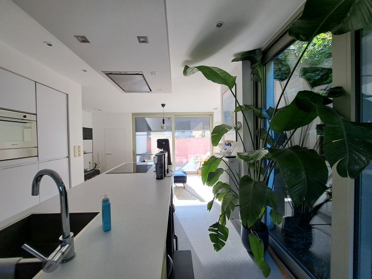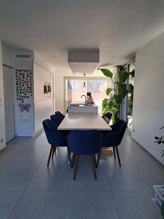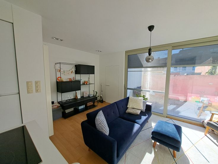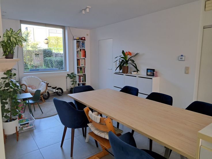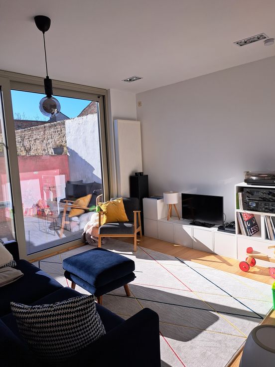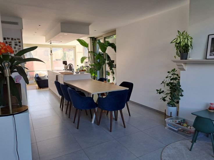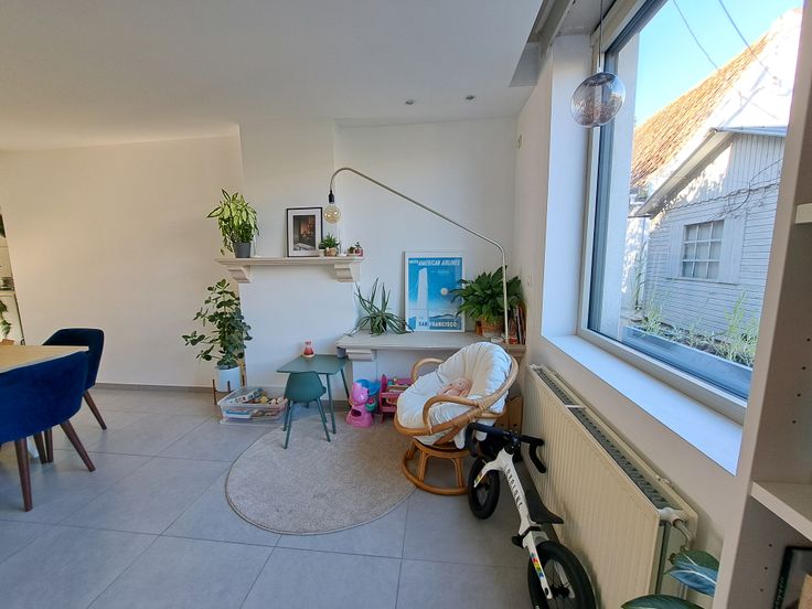 De woning is bereikbaar via een charmante inkomhal met ingebouwde kast of via de zijkant. De centraal gelegen keuken zorgt voor een open gevoel tussen de eetplaats aan de voorzijde en de zithoek achteraan. Ze is uitgerust met dubbele koelkast, inductiekookplaat, recente vaatwasser, microgolf en nieuwe oven. Grote raampartijen en een terras zorgen voor veel licht en zon tot in de namiddag.