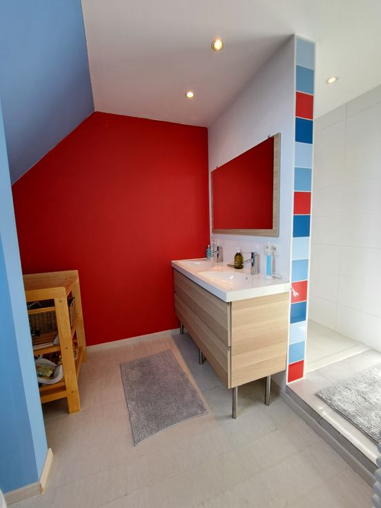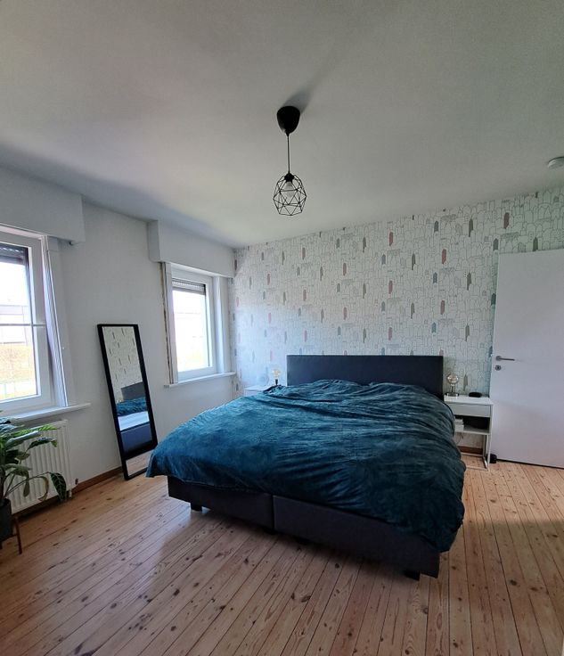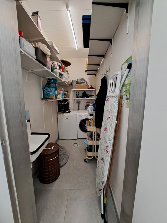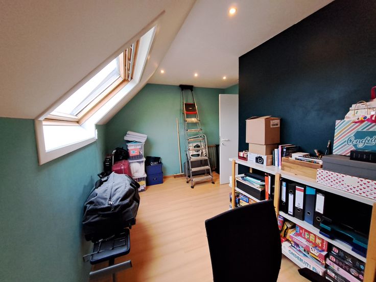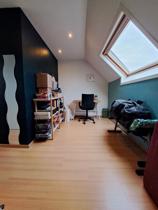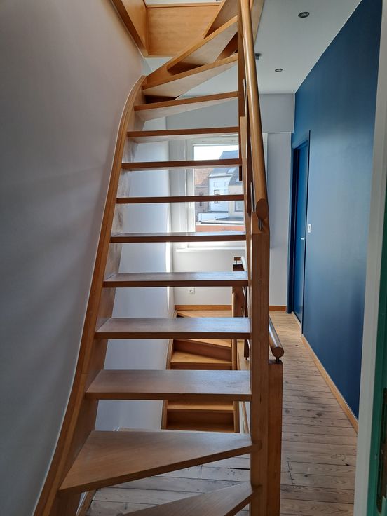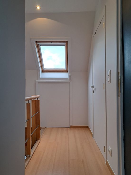 Op het gelijkvloers bevinden zich ook een berging/wasruimte, een kelder en een apart toilet. De vernieuwde traphal leidt naar de eerste verdieping met twee slaapkamers en een ingebouwde kleerkast. Op de tweede verdieping: een badkamer met douche, dubbele lavabo en toilet, en een extra kamer als slaapkamer, bureau of bergruimte. Bovenaan is er nog een zolder.