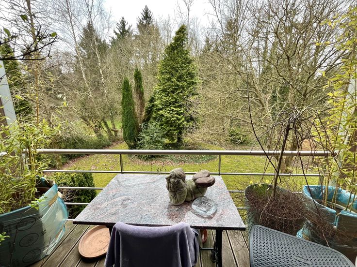 * Petite terrasse donnant sur un jardin commun verdoyant