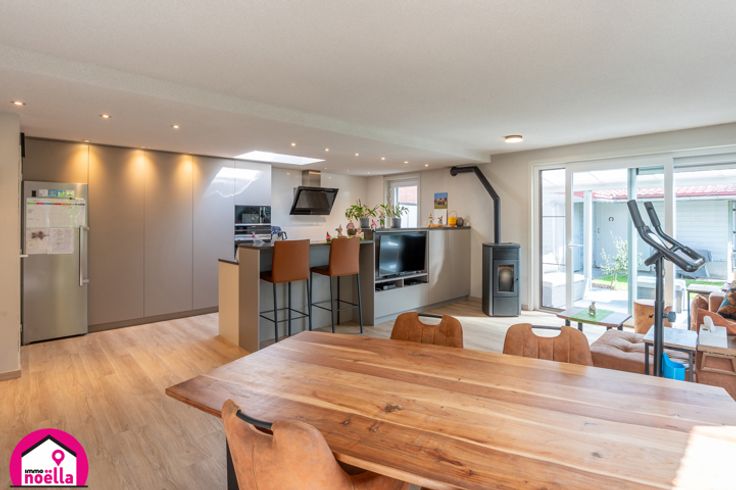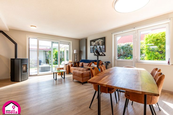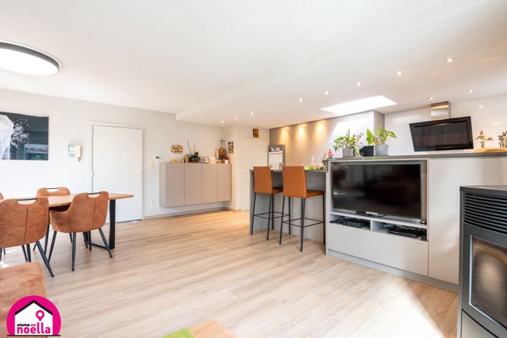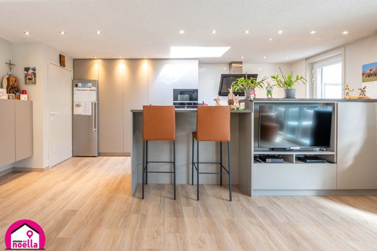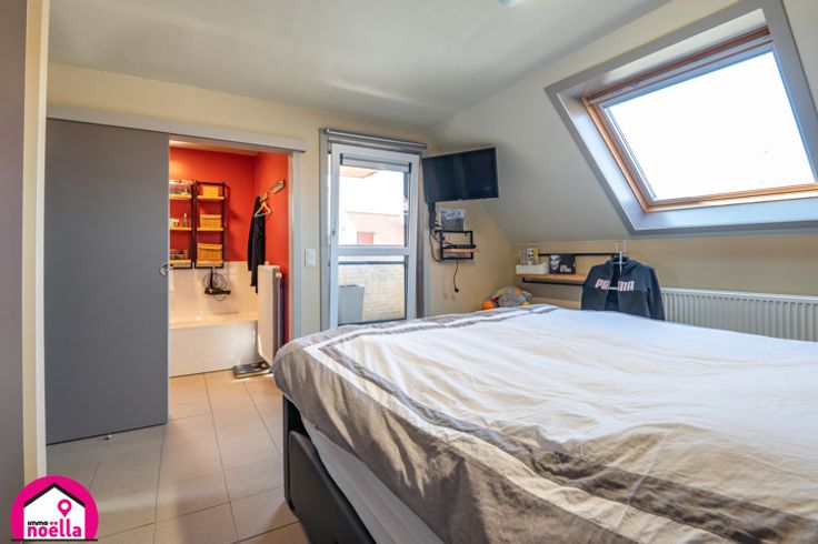 De woning biedt drie volwaardige slaapkamers, waarvan één op het gelijkvloers, en een royale zolder die eenvoudig als extra slaapkamer kan worden ingericht. De benedenverdieping straalt ruimte en comfort uit, met een ruime living die aansluit op een volledig ingerichte open keuken en met direct contact naar de tuin met het overdekt terras. Daarnaast vinden we hier een slaapkamer, een badkamer met douche en toilet, en prachtig op maat gemaakte kasten die functionaliteit en stijl combineren.