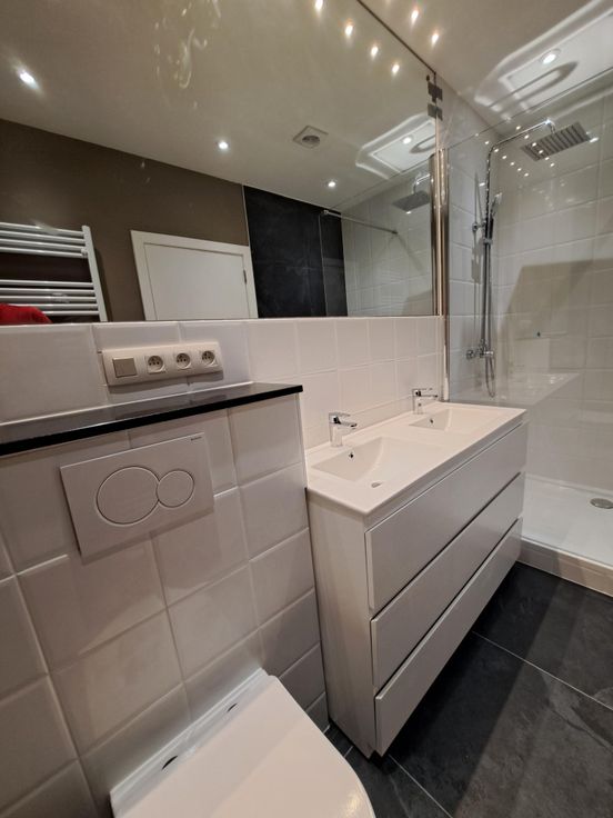 Porte blindée, hall d'entrée désservant les pièces à vivre. Séjour lumineux, cuisine américaine hyper équipée avec tous les électros y compris le micro-onde, tablette de cuisine en granite, un espace buanderie fermé avec une chaudière individuelle ainsi qu'un grand espace de rangement. Une très belle salle de douche avec un wc suspendu, une armoire avec 3 tirroirs, une double vasque, un grand mirroir ainsi qu'une grande douche (150X90cm).