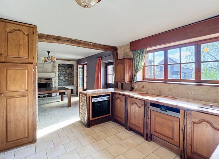 Derrière sa façade en pierre pleine de charme, se dévoile une habitation d’exception, alliant le cachet de l’ancien à la noblesse des matériaux : pierre bleue, menuiseries en chêne