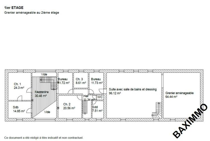 1ier Etage : Spacieuse mezzanine, 3 chambres, 2 bureaux, une salle de bains, une salle de douche, WC séparé, une impressionnante suite parentale de 96m², espace aménageable de 64m² (au-dessus du garage).