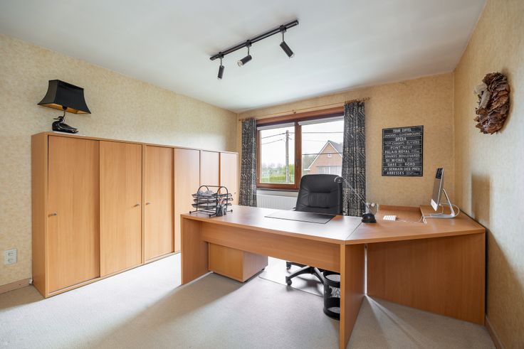 Langs een ruime oprit met voortuin kom je de woning in via de ruime inkomhal met bibliotheekwand en de trap naar de 1e verdieping.