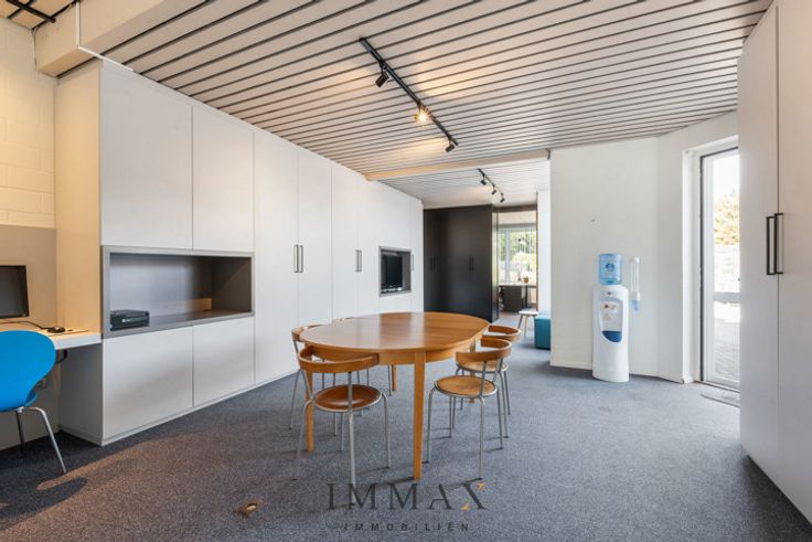 Het gelijkvloers is stijlvol ingericht als kantoorruimte met aparte vergaderzaal en toilet met achteraan nog een afzonderlijke bureauruimte (circa 100m²).