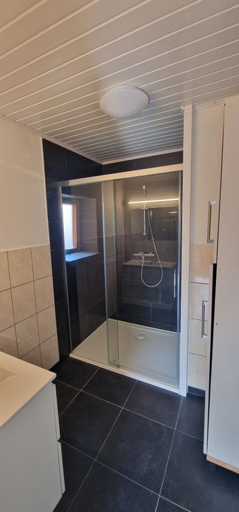 leefruimte, badkamer met douche en lavabomeubel,apart toilet,