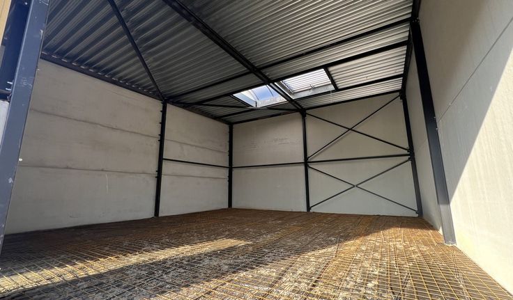 Specificaties: 1 automatische sectionale poort per unit 4m x 4m, 6m vrije hoogte, polybetonvloer (2T/m²), geïsoleerd steeldeck dak met lichtstraat, led-armaturen, afvoer sanitair, 32A, septische put 2000l en regenwaterput 3000l per unit, fietsenstalling met 2 laadpunten, 1 parking per unit met wachtbuis voor laadinfrastructuur, brandklasse C