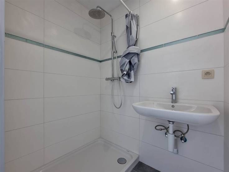 Ingerichte keuken met gootsteen, kookplaat, koelkast met vriesvak, apart toilet met wasmachine, lichte woonkamer, kleine slaapkamer, doucheruimte met douche en wastafel, aantrekkelijk hoekterras op het zuidwesten met erkers.
