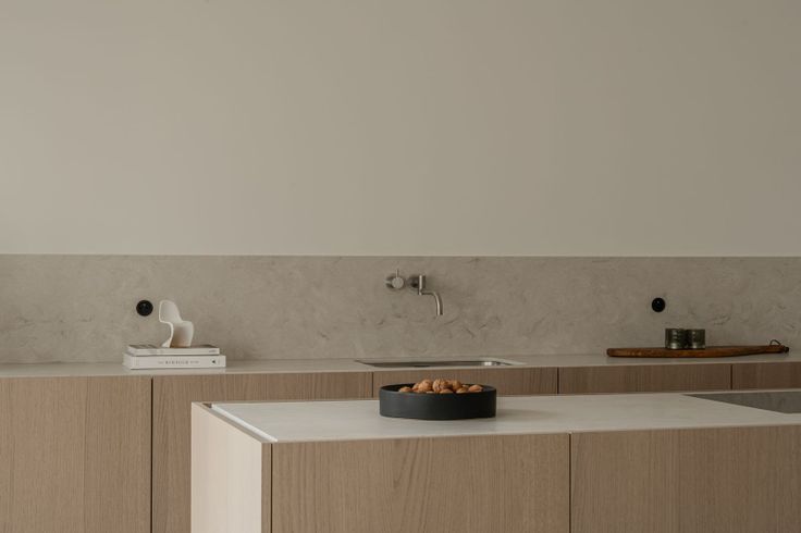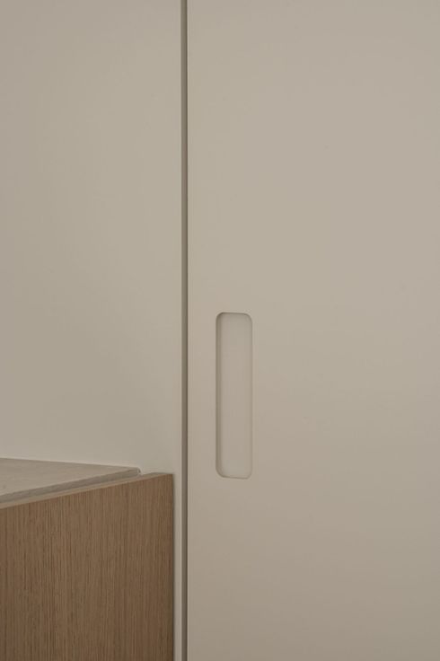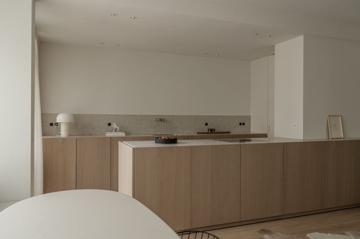 De leefruimte vloeit moeiteloos over in een maatwerkkeuken met houten fronten, een composiet werkblad en hoogwaardige toestellen, waaronder een BORA-inductiekookplaat, combi-oven en geïntegreerde vaatwasser. De aansluitende berging biedt aansluitend wasvoorziening en extra opbergruimte, doch uit het oog onttrokken.