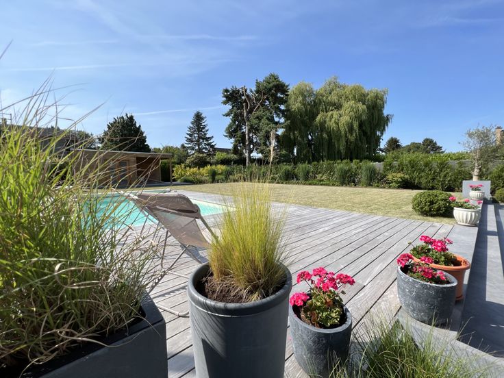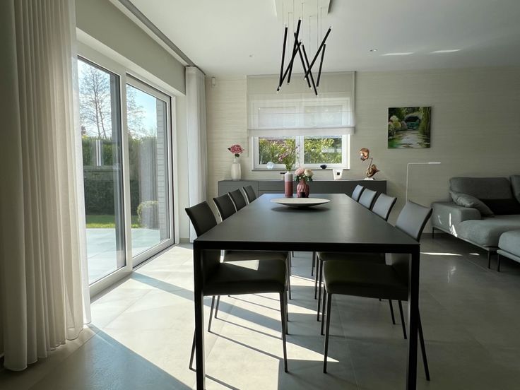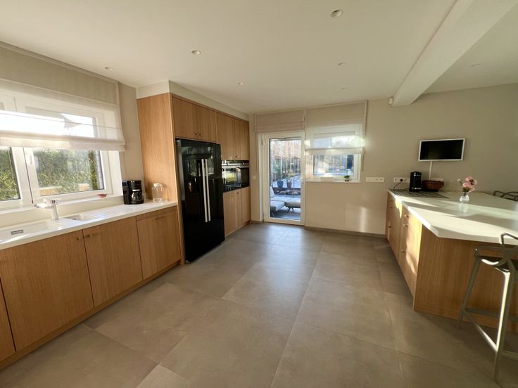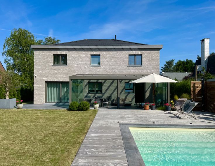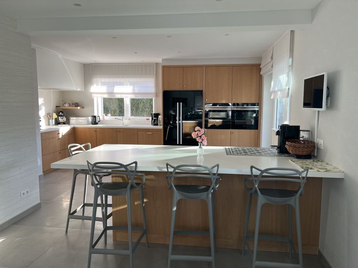 • RDC : hall avec placards & WC, bureau, vaste séjour en L lumineux avec baie vitrée, cuisine en chêne full équipée (îlot central, frigo américain, plaque à induction, four multifonction, four à vapeur, tiroir chauffant – Siemens), véranda alu Reynaers donnant sur terrasse sud.