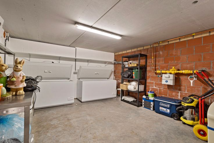 Via de handelsruimte begeeft men zich naar de kelderverdieping, deze heeft dezelfde oppervlakte als het gelijkvloers en biedt uitzonderlijk veel bergruimte, ideaal voor extra werkruimte, opbergruimte of in te richten als hobbykamer. Een liftschact werd reeds voorzien tot toegang tot deze ruime kelder/opbergruimte.