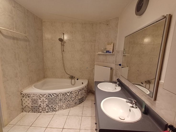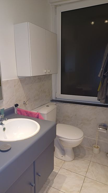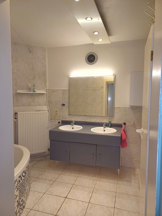 ° Badkamer (Dubbele wastafel, bad/douche, WC, kast met aansluiting
