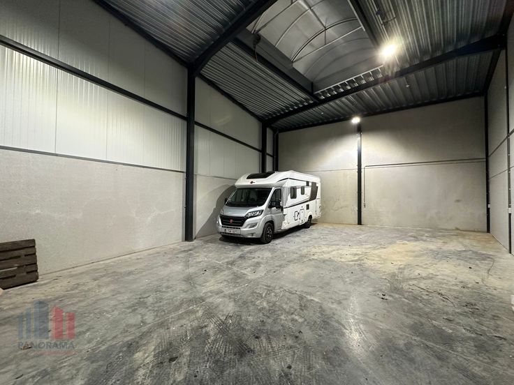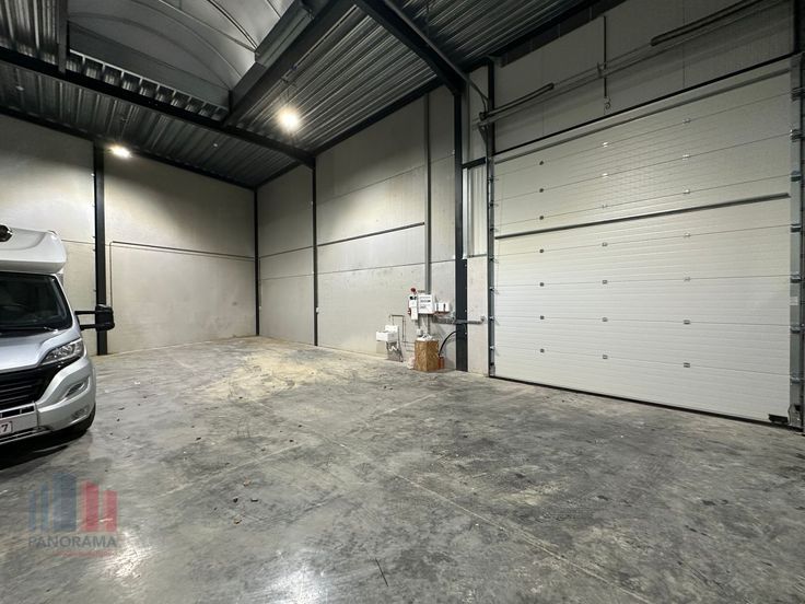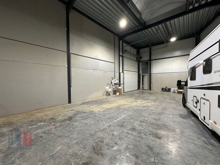 De geïsoleerde loods is opgebouwd uit een staalstructuur, betonplint tot deurhoogte, sandwichpanelen en steeldeck.