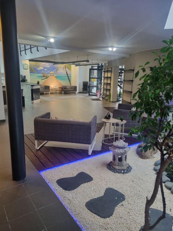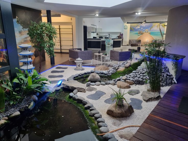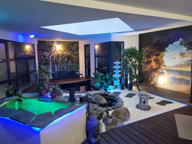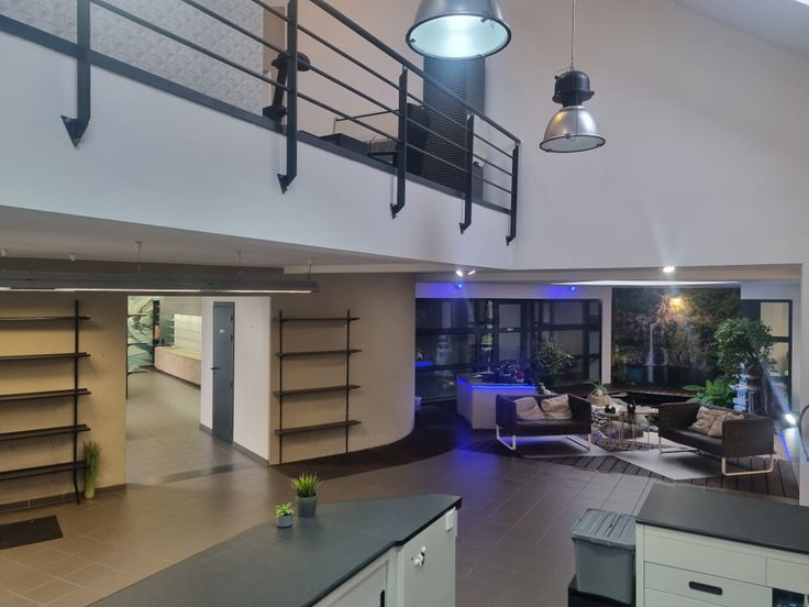 La partie pro comprend un vaste showroom avec étang intérieur (jardin zen), une mezzanine/bureau, un grand comptoir, 1 wc, 5 pièces, une grande réserve et un garage. Poêle au pellet.