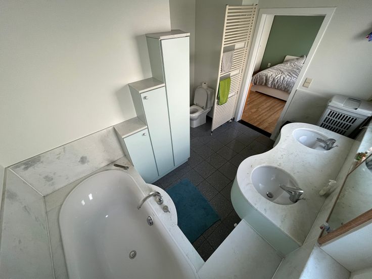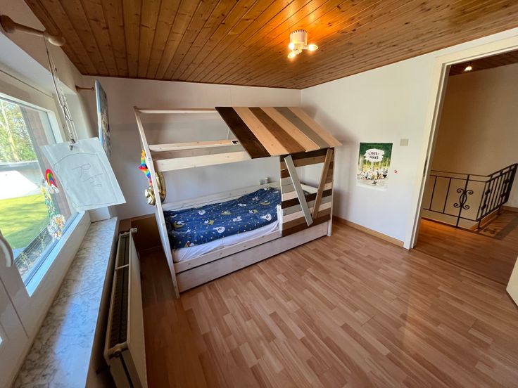 Eerste verdieping: drie slaapkamers waarvan één met lavabo, een aanpalende zolderkamer met lavabo en veel bergruimte achter de kamers.