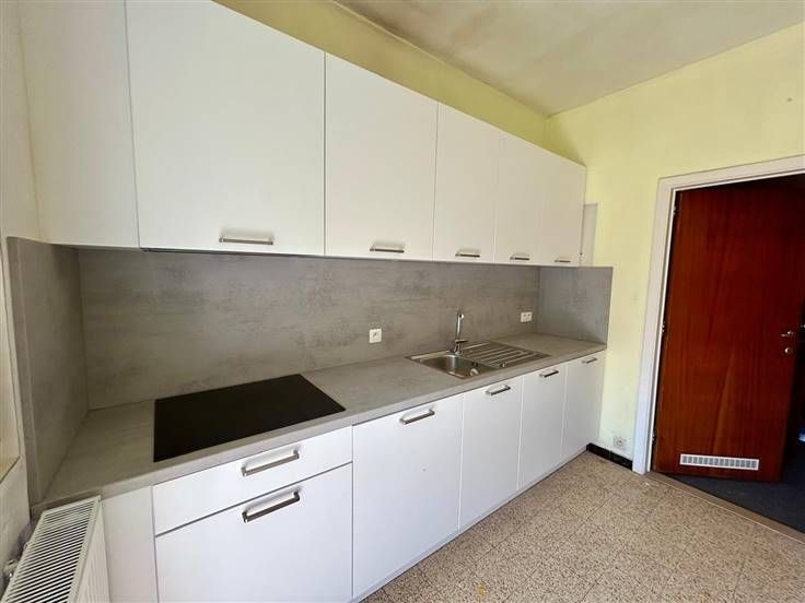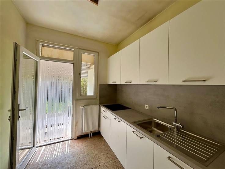 Binnenkomen in de inkomhal met vestiairekast. Leefruimte vooraan met zicht op privé voortuin. Aparte keuken met toegang tot de zonnige tuin.