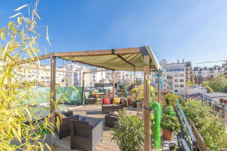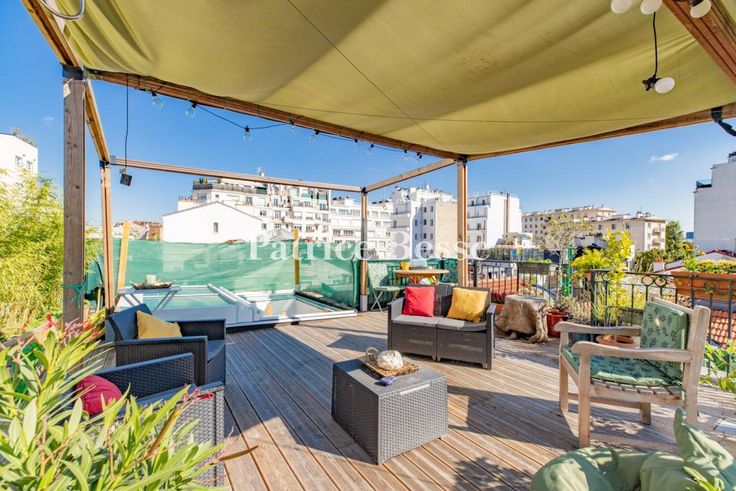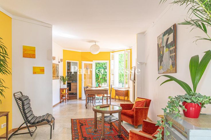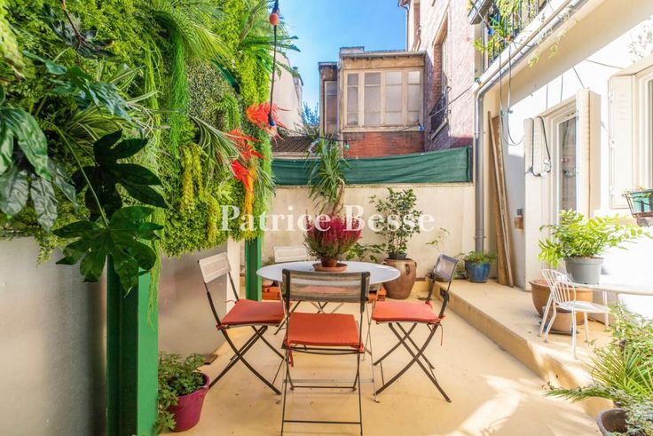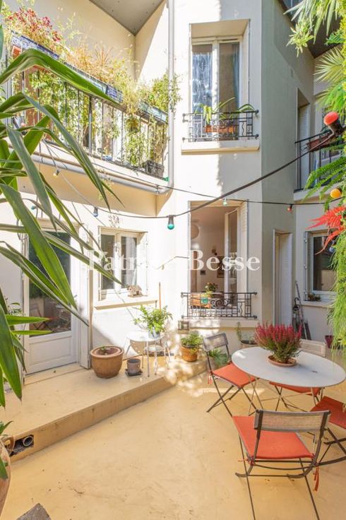 Dans le 16e arrondissement, une maison Art déco rénovée, en pleine propriété, et sa terrasse sur la canopée des villas privées mitoyennes. Le bien est mitoyen de deux pittoresques villas qui font la renommée du quartier. Ces dernières, « maisons unifamiliales de campagne et d'agrément », sont issues d'un concept né en Europe à la fin du 19e siècle. La maison, elle, date de 1928. De part et d'autre de sa façade, se tiennent des constructions de moins de trois niveaux. Côté rue, la façade en brique est élevée de deux étages, dont un sous combles. Le rez-de-chaussée, surélevé, est percé de deux soupiraux qui éclairent une cave. Le plan en L et la cour qu'elle inclut procurent à l'habitation un éclairage naturel et traversant. Au fond, le mur mitoyen est végétalisé. La modénature de la façade sur rue est asymétrique. Une frise horizontale en pâte de verre parcourt le mur du rez-de-chaussée, et souligne le plein cintre de la porte d'accès à la maison, vitrée, protégée par une grille en fer forgé et surmontée d'une imposte en fer et verre. Deux fenêtres, de largeurs différentes, jouxtent la porte en position dominante. Les baies sont soulignées par des appuis, tableaux et linteaux peints. Le premier étage présente trois baies en symétrie, celle du centre étant surmontée d'une corniche en chapeau de gendarme peinte qui s'étend au-dessus des deux ouvertures latérales. Toutes sont munies de garde-corps en fer forgé et de volets métalliques, qui assurent l'occultation des baies aux