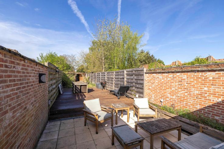 De westgerichte tuin is volledig omheind met ruim aangelegd terras.